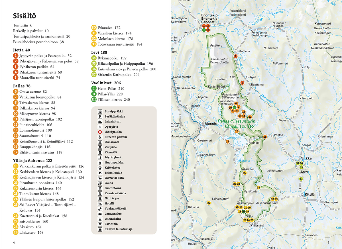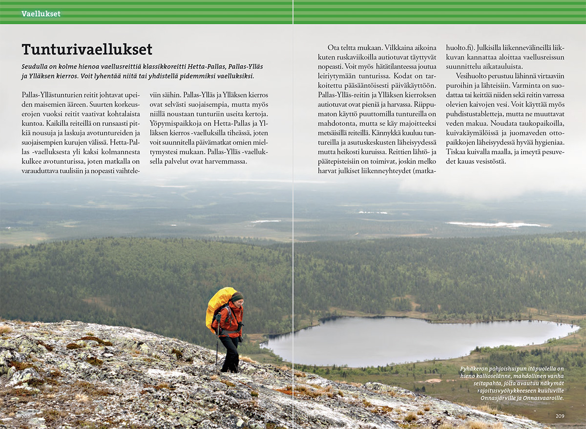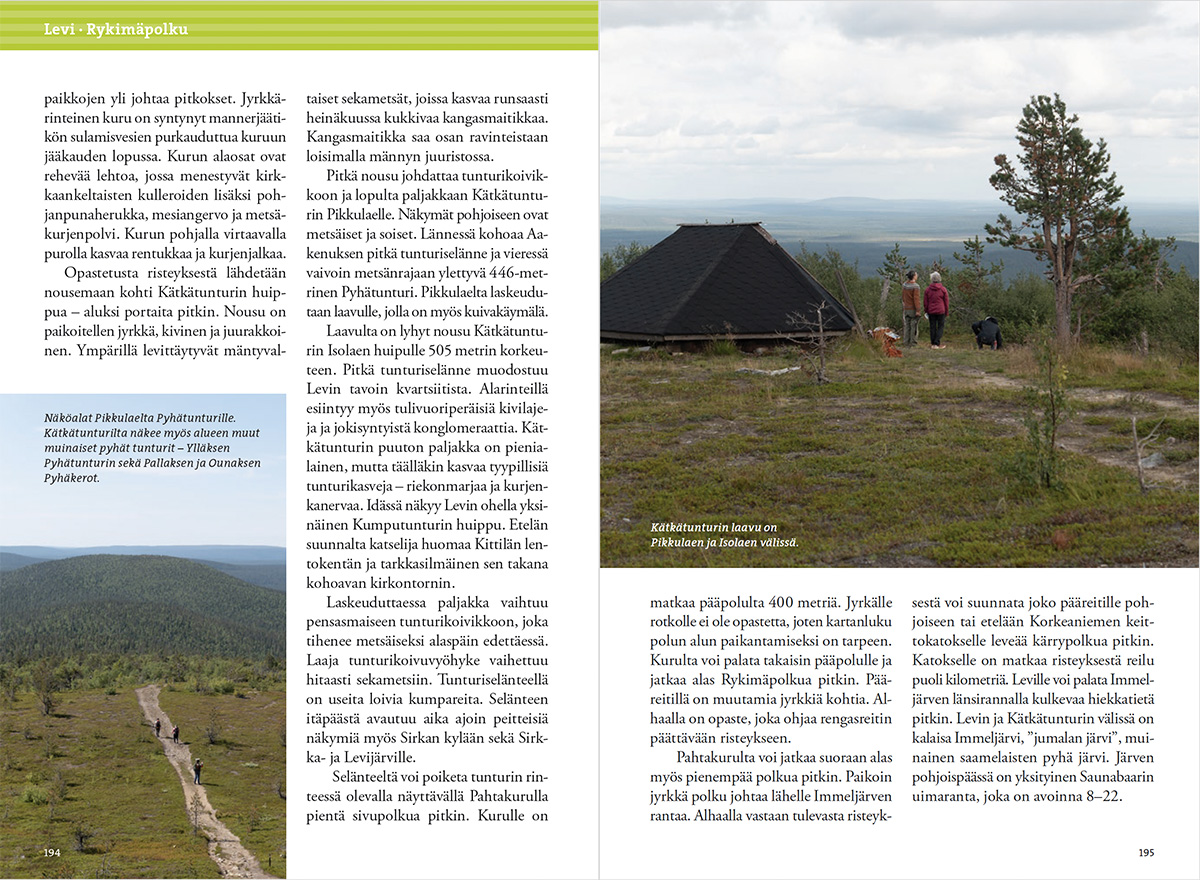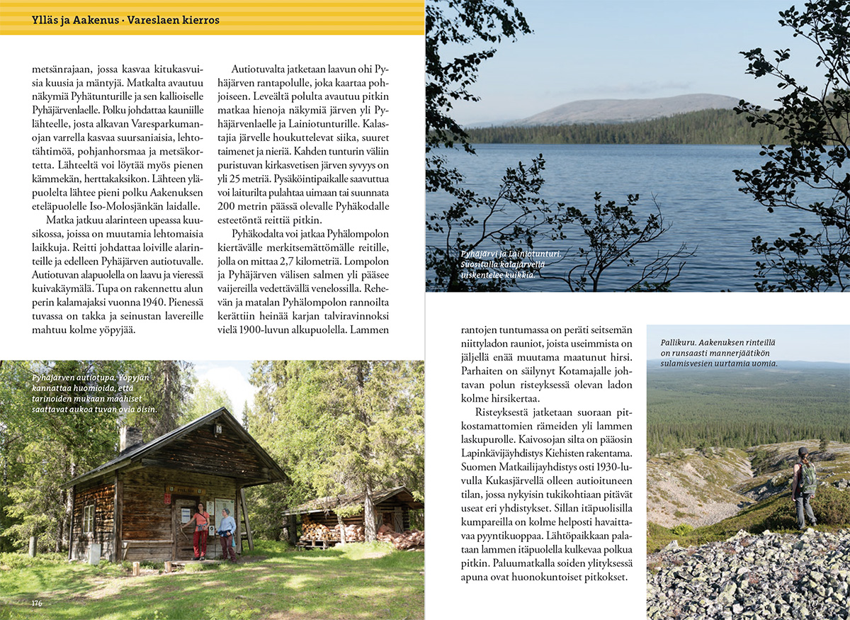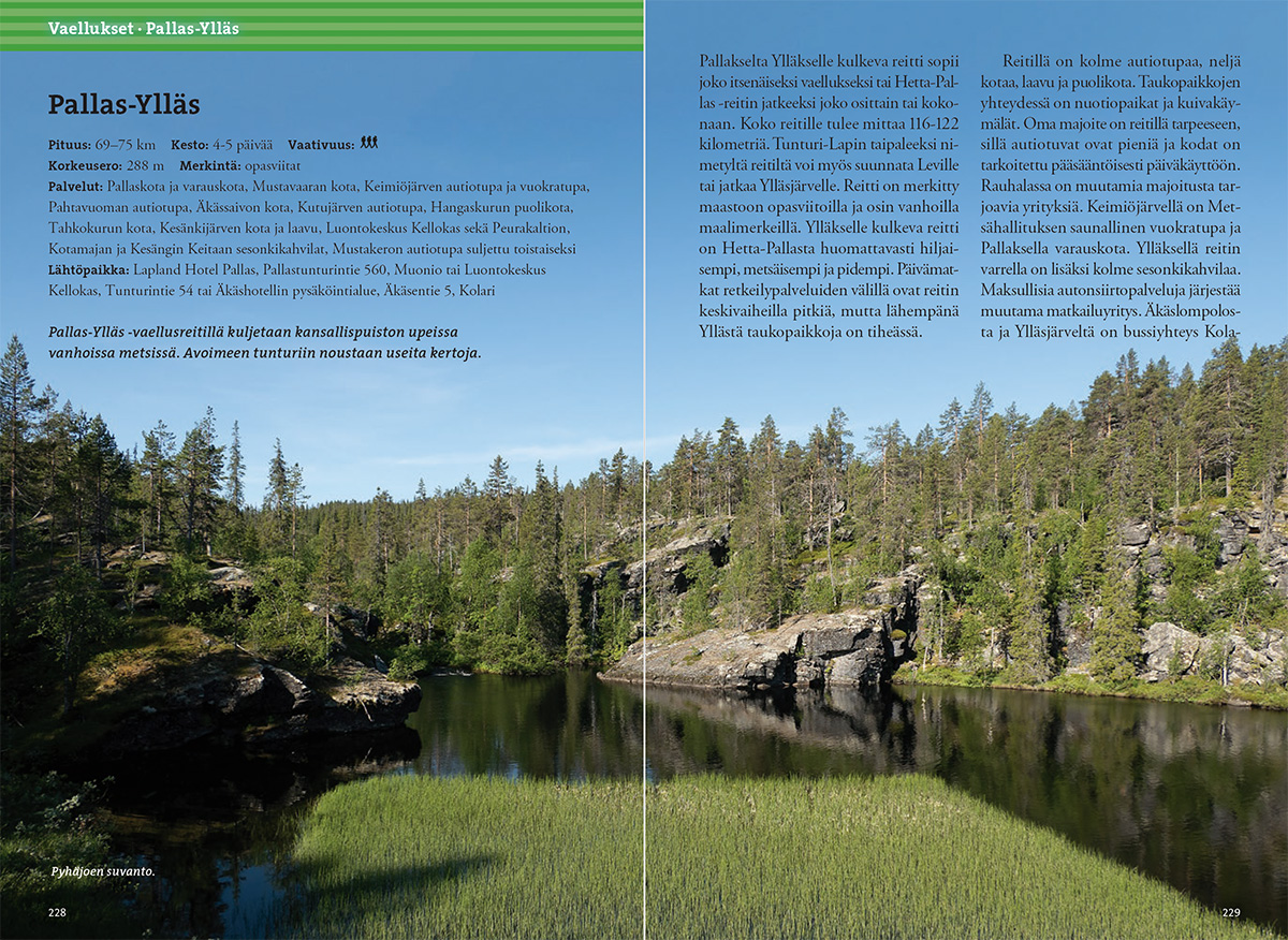 Denne guideboken, skrevet på finsk, presenterer 46 dagsturer og 3 lengre vandreruter. Den dekker hele nasjonalparken med omkringliggende sommerruter samt merkede stier rundt Hetta og Levi. Boken er delt inn i fire geografiske områder og inneholder også kapitler om natur og historie, i tillegg til praktiske råd for en vellykket tur.