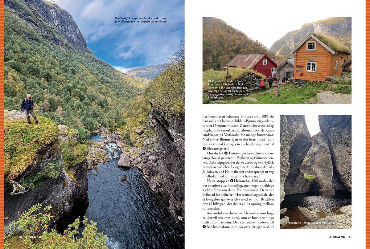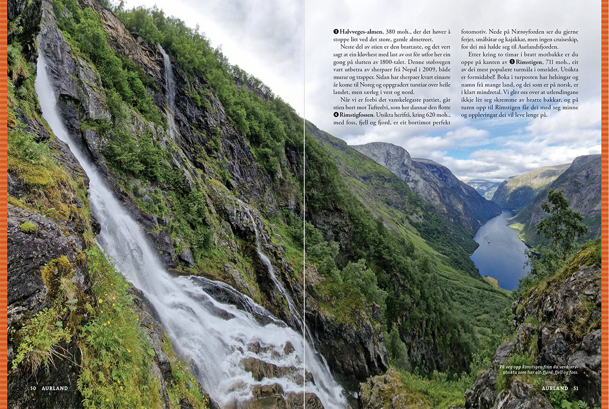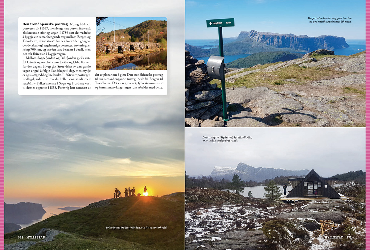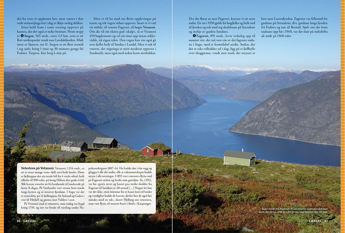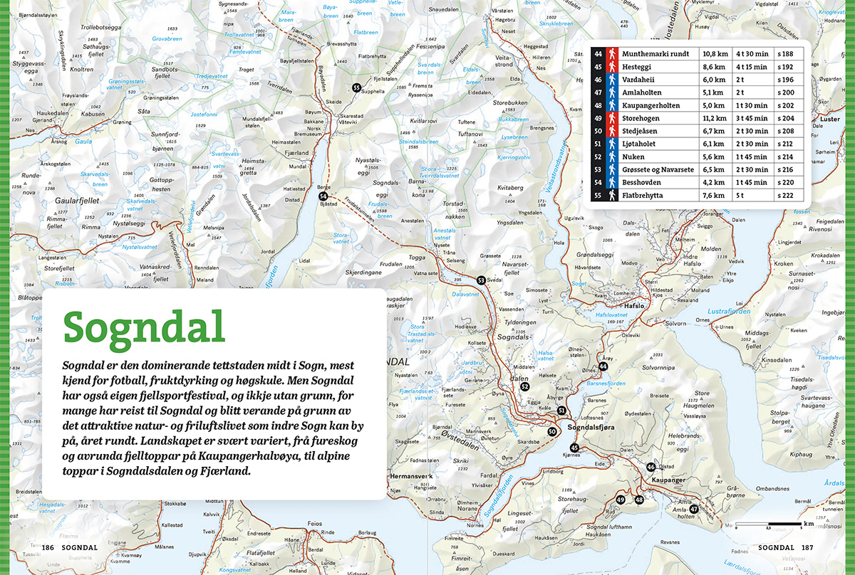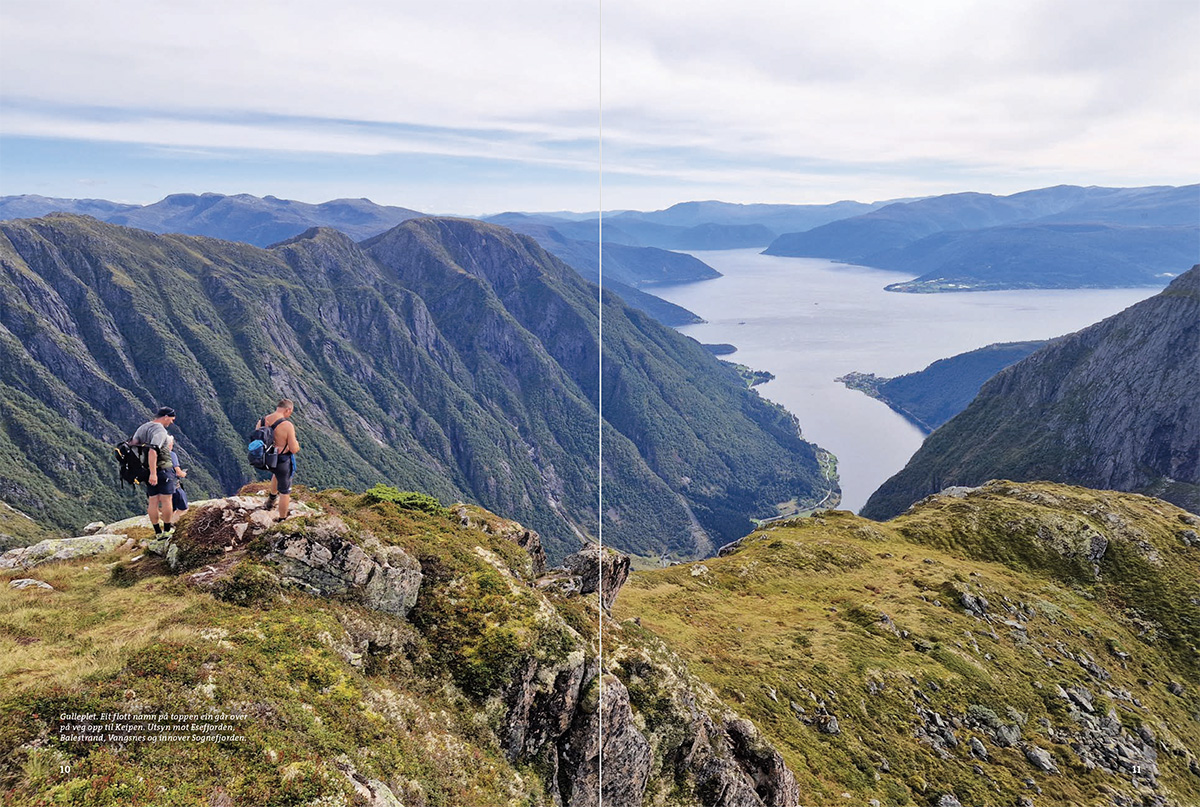 – og det er aldri langt til Sognefjorden, den lengste og kanskje flottaste av alle norske fjordar. Her er turar som passar for alle, anten du vil ha ein utfordrande topptur, ein hyttetur, ein fin ettermiddagstur eller ein tur med borna. Klassikarane er sjølvsagt med: Aurlandsdalen, Kongevegen over Filefjell, Vettisfossen, Fanaråken, Molden, Keipen og Lihesten.