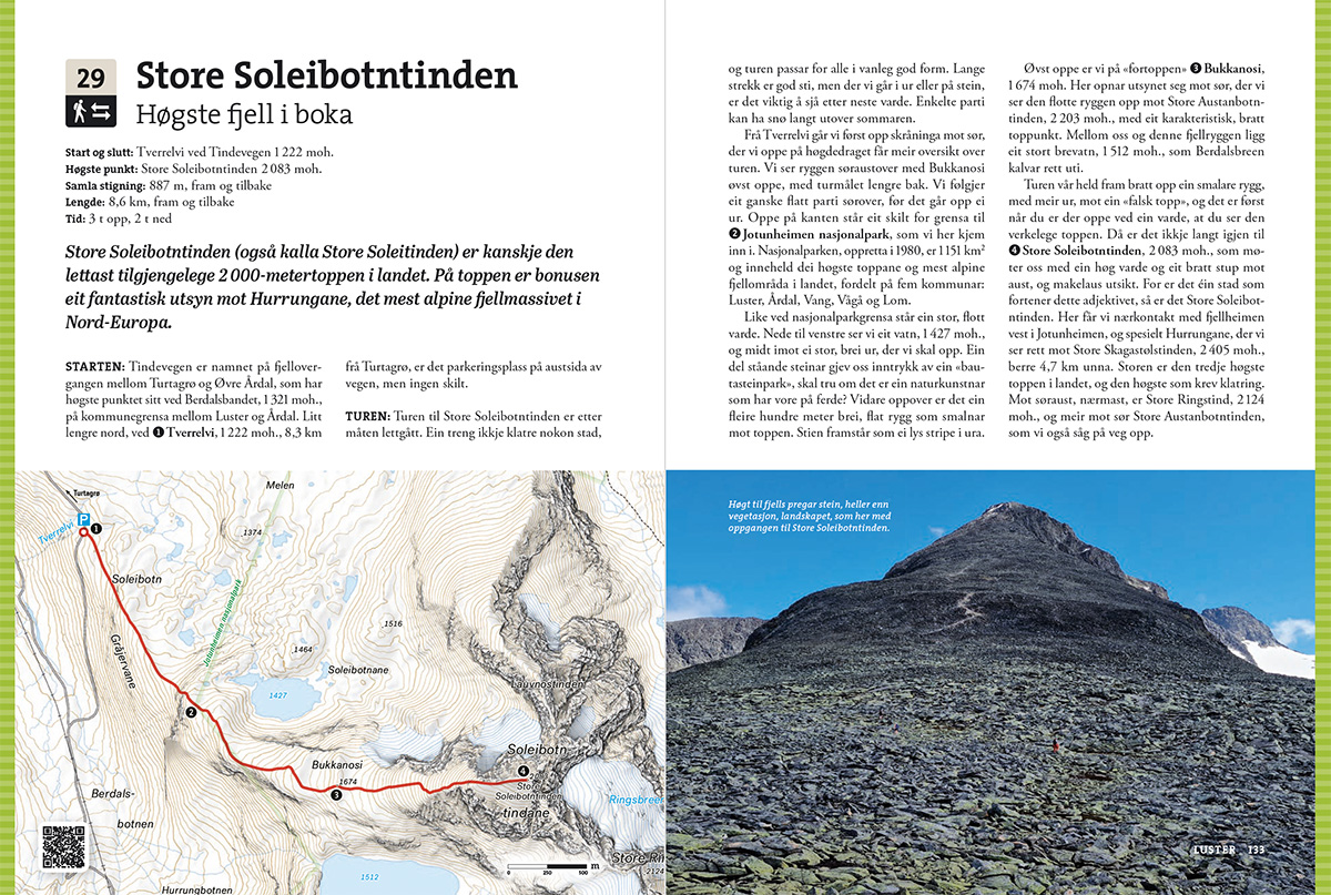 Kvart kart i denne boka er utstyrt med ein QR-kode. Skann koden med mobilkameraet, så kan du enkelt følgje turforslaget på telefonen.