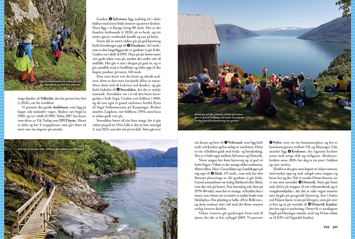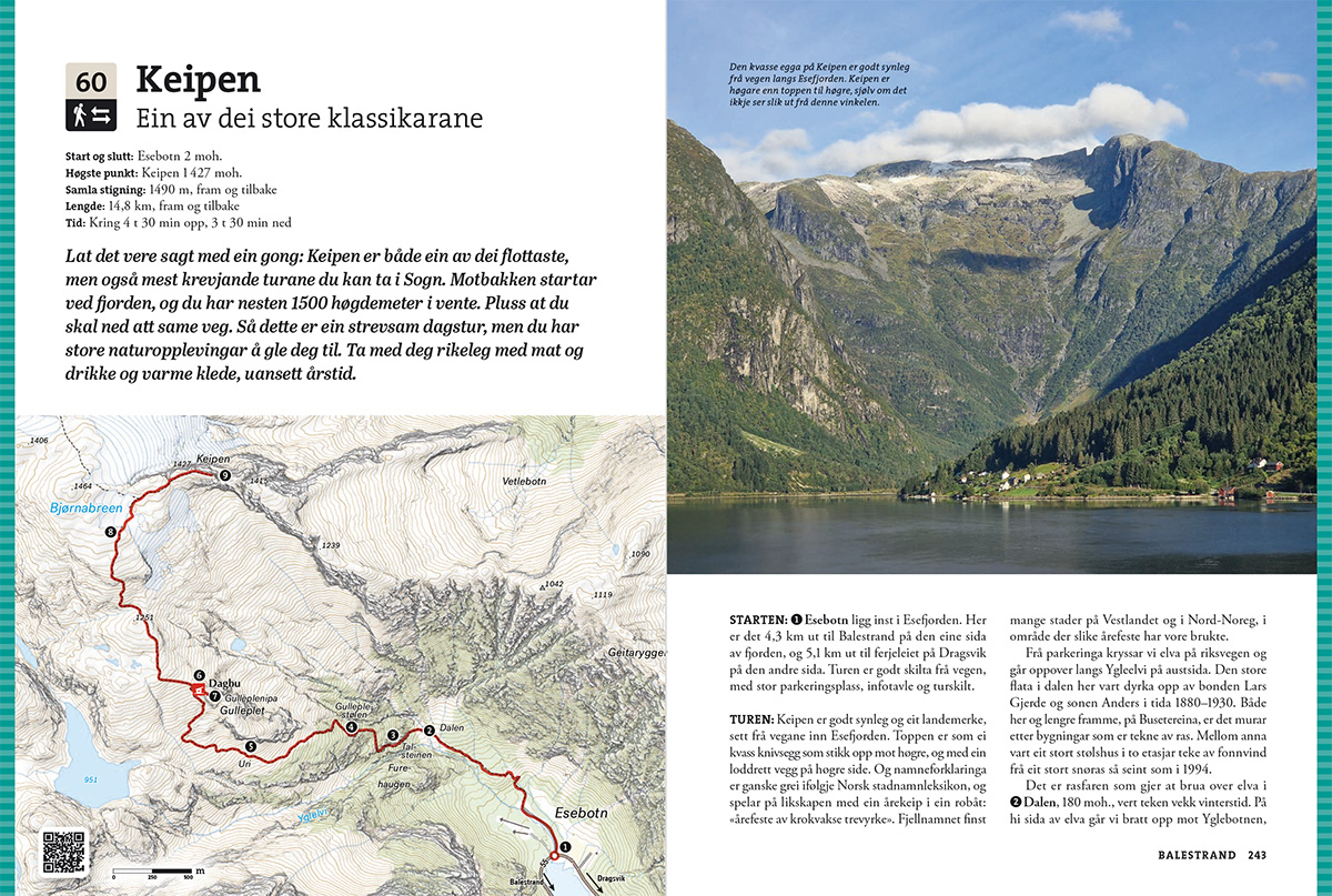 Aurland, Lærdal, Årdal, Luster, Sogndal, Leikanger, Balestrand, Vik, Høyanger, Gulen, Solund og Hyllestad. Boka gir deg alt du treng for å planleggje turane, med gode skildringar og detaljerte kart til kvar tur.