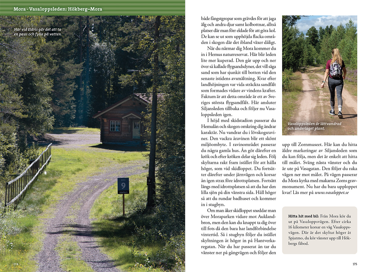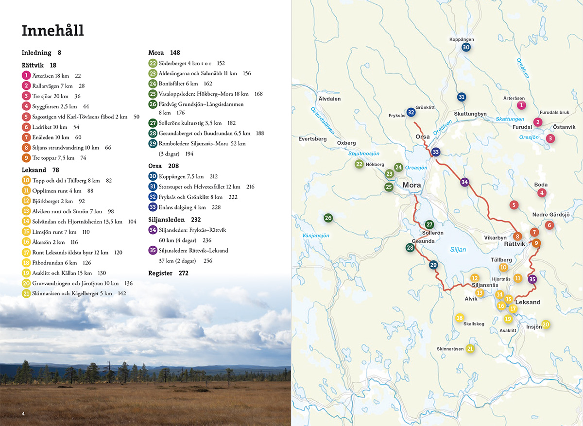I den här boken beskrivs 35 vandringar som du når från olika utgångspunkter kring Orsa, Mora, Rättvik eller Leksand. Turförslagens längd varierar mellan 2 och 60 kilometer. Vissa turer är rejält kuperade och tar hela dagen, medan andra går på plant underlag och passar utmärkt som en kort utflykt. Ett kapitel i boken behandlar Siljansleden och beskriver några fina övernattningsturer längs leden.