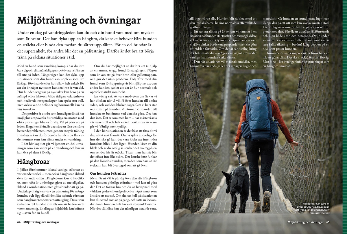 Boken innehåller också konkreta övningar som hjälper både dig och din hund att bli förberedda på nya situationer och miljöer – till exempel när ni möter vilda djur eller ska ta er över en gungande hängbro.
