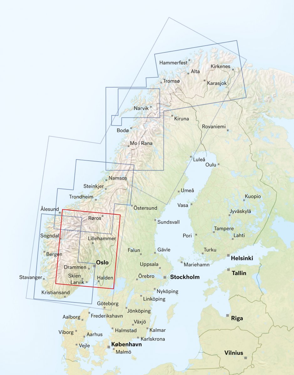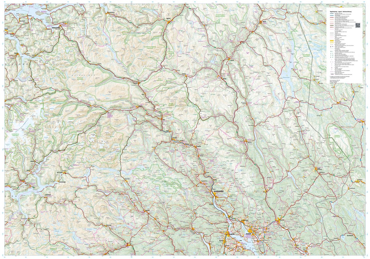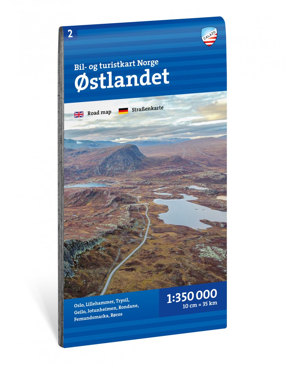 Et nytt og oppdatert veikart over Østlandet – en region som strekker seg fra Oslofjorden til fjellområdene i nord. Kartet dekker populære reisemål som Jotunheimen, Rondane, Dovrefjell og Hardangervidda.