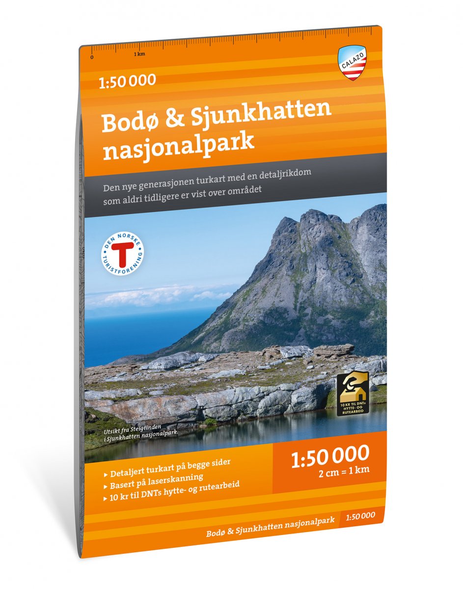 Med kartvisninger på både for- og baksiden dekker dette kartet hele området kring Bodø og Sjunkhatten Nasjonalpark.