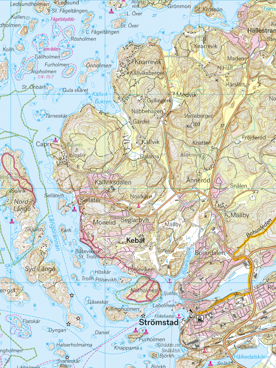 Den här kartan omfattar Strömstad, Koster, Grebbestad, Fjällbacka, Väderöarna, Bovallstrand och Kynnefjäll.