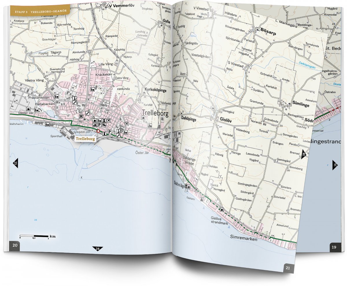 Den här cykelatlasen täcker hela ledens sträckning med 20 special­utvecklade kartor i behändigt bokformat. Kartorna visar om leden går på asfalt eller grus, om det är cykelbana eller trafikerad väg och var det finns cykelservice, kaféer och boenden.