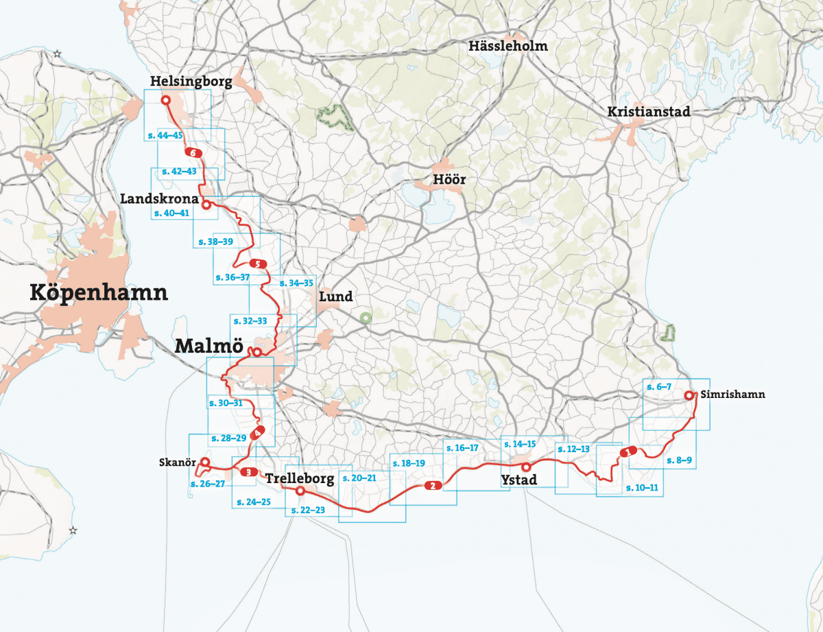 Sydkustleden följer den skånska kusten från Simrishamn till Helsingborg. Leden är 26 mil lång och uppdelad på sex etapper. Du tar dig mestadels fram på lättrampade cykelbanor eller småvägar med gles biltrafik. Utbudet av både boende och mat är stort längs vägen och du passerar ett oräkneligt antal fina stränder, badklippor, bryggor och kallbadhus.