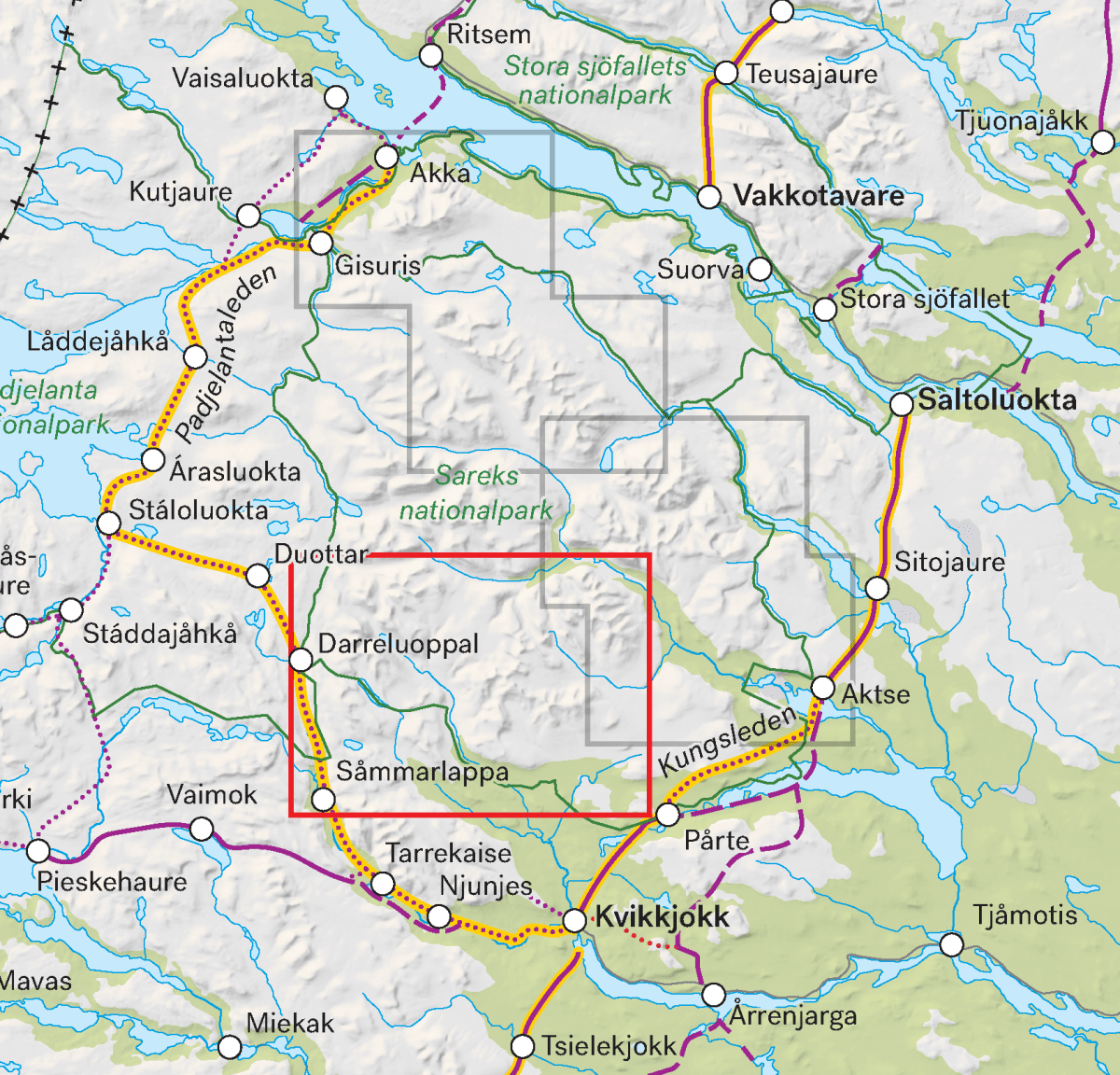 Kartan omfattar Tsähkkok, Svenonius glaciär, Tsahta, Bielloriehppe, Lullihatjåhkkå, Balgattjåhkkå, Boarek och Gådoktjåhkkå.