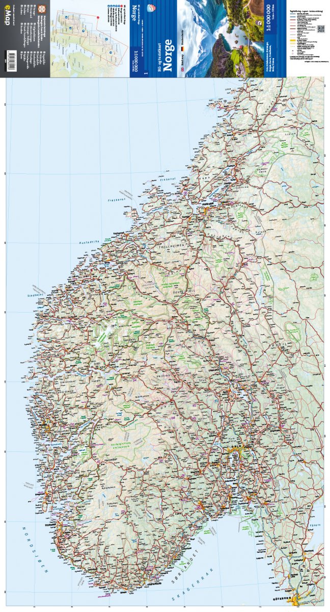 Et nytt og oppdatert veikart over hele Norge med tydelig markerte nasjonale turistveier og severdigheter. Perfekt for å planlegge din neste biltur gjennom landet.