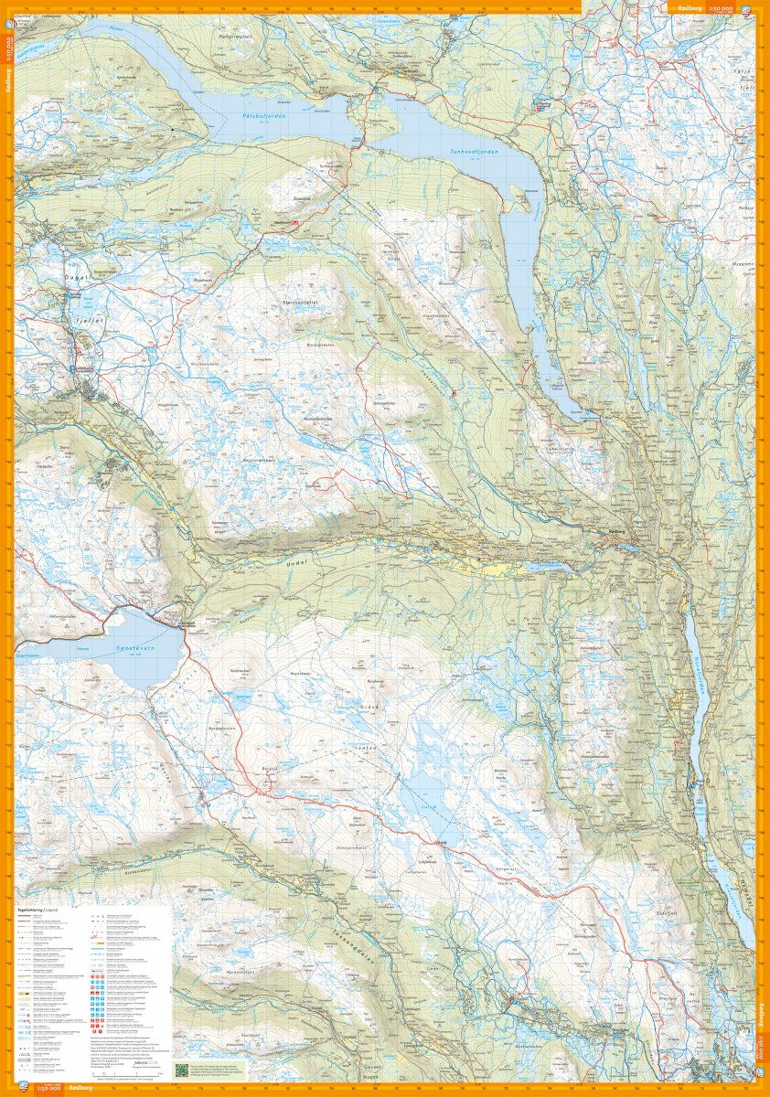 Kartet dekker alle de mest populære fjellområdene, merkede turruter i området, DNT-hytter og private overnattingshytter. Det fungerer like godt om vinteren med merkede vinterruter og preparerte skiløyper.
